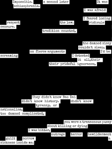 NaPoWriMo 2026 Day 11 NaPoWriMo 2026 Day 11 prompt: “Write” (compose, create, or better, recompose) an erasure (aka, blackout) poem. I used part of “The Rainy River” chapter of The Things They Carried by Tim O’Brian. Share this: Share on Facebook (Opens in new window) Facebook Like Loading... Related