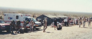 We heard a distinctive beep as each marcher walked over the starting strip. That sound is an electronic signal from a timing chip attached to a shoelace. I noticed a barefoot participant, who tied it to his ankle. I would see him two more times; once, struggling in agony just past the 10-mile marker. I notified the next staff member I saw. The next time he was riding on the back of a golf cart on his way to a medical tent. Since then, footwear has been required. The military is good at making rules for common sense. I’ve seen barefoot marathoners before, but they ran on paved roads. This was a rough desert environment.
