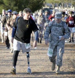 Many other marchers were combat veterans and wounded warriors, some who had been seriously injured. Seeing men and women with all sorts of physical and mental war injuries, many wearing various kinds of prostheses, some blind and being assisted by guides, but all doing what I was doing; I was emotionally moved, and I hushed the objecting voices in my head. I may have had more than 30 years on most of those folks, but I did not have to carry a spare leg in my backpack, in case my prosthesis broke or malfunctioned. I didn’t need a guide because I had been blinded by an IED in a foreign country.