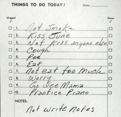 Johnny Cash wrote to-do (and not to) lists. On one he wrote to kiss his wife, to not kiss anyone else, and to stop making lists. That’s on my list, too.