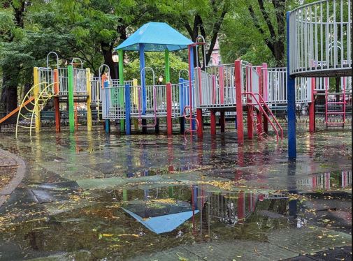 The sweet, delightful, and flashy Mistress of Fiction, Rochelle, has prompted my muse with a bit of rain for the second week in a row. Combining strokes from her purple lane, she has splashed the Friday Fictioneer gang with a Roger Bultot picture of a modern, colorful, children’s playground park, seemingly after some precip.